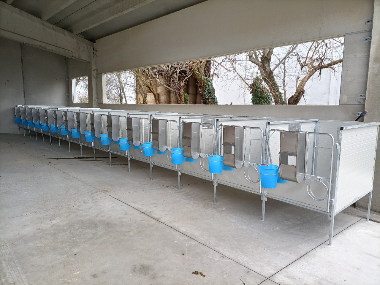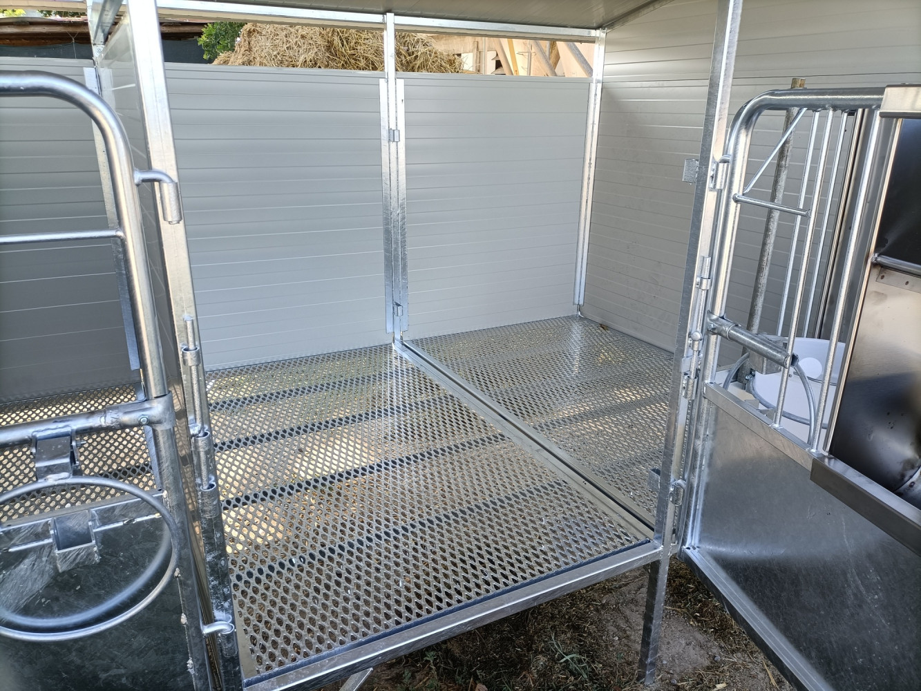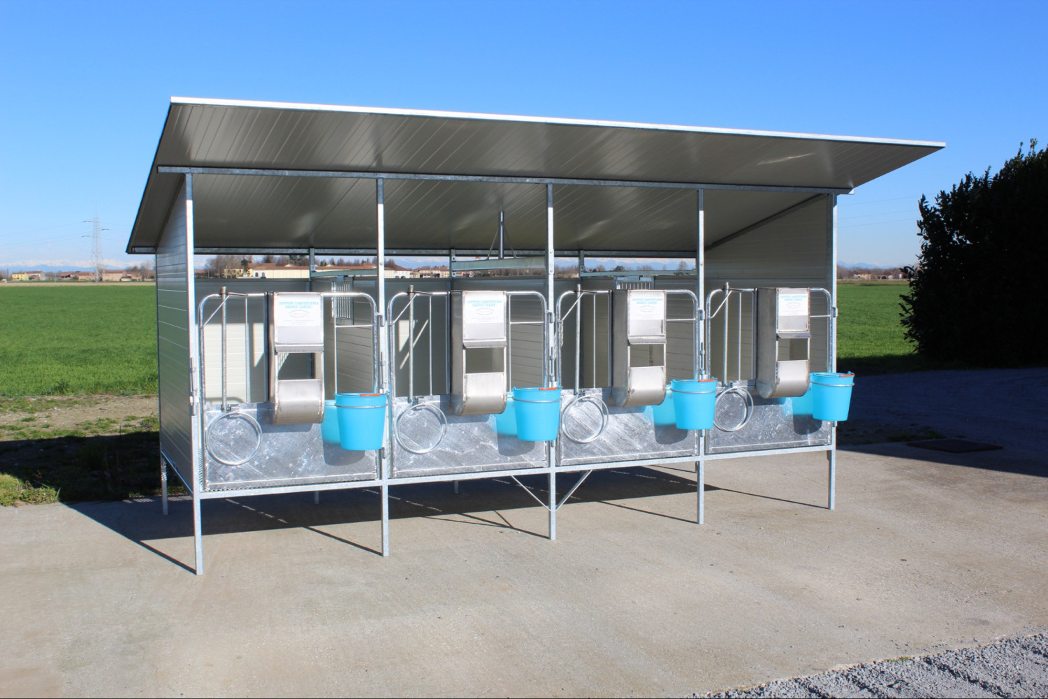 box svezzamento vitelli a 2 posti, grigliato estraibile, mangiatoia inox per mangime e fieno cancello con cattura e due porta secchio, pareti e copertura in pannello coibentato. Dimensioni: 190x150/200 cm