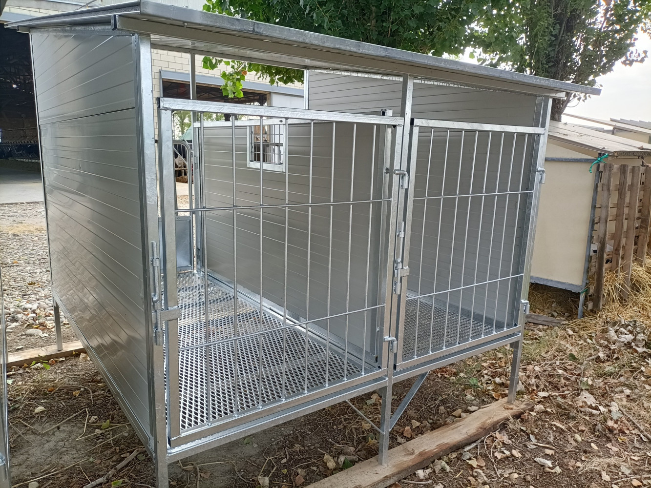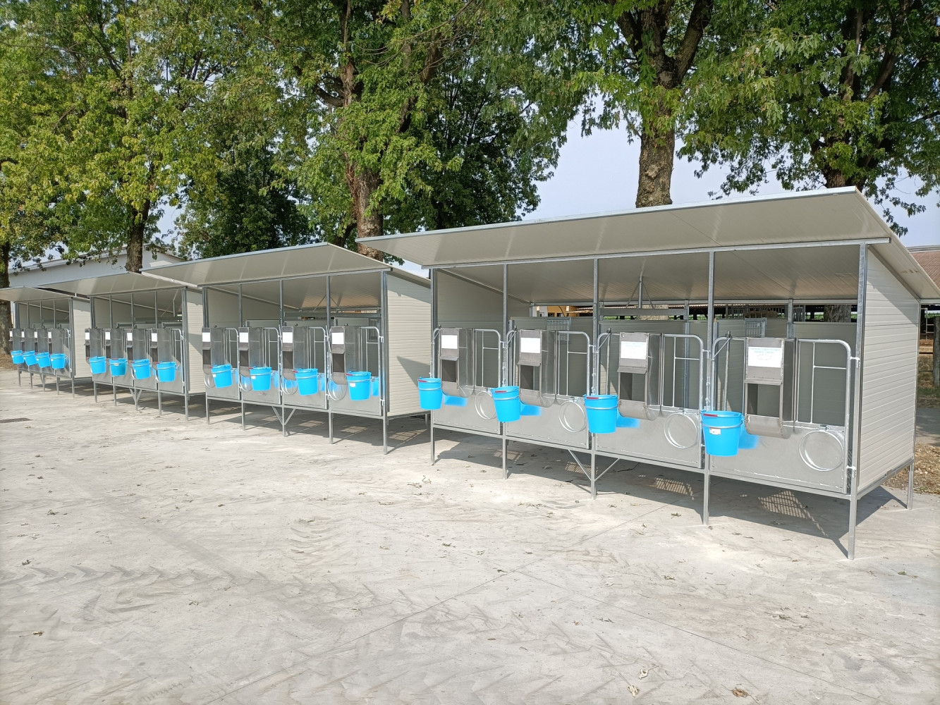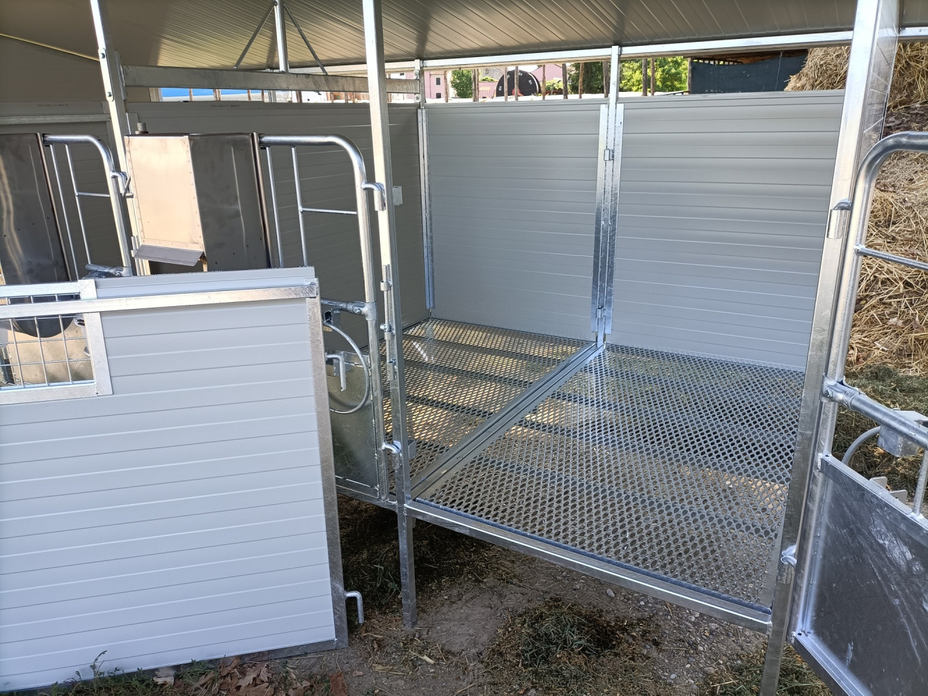box svezzamento vitelli a 2 posti, grigliato estraibile, mangiatoia inox per mangime e fieno cancello con cattura e due porta secchio, pareti e copertura in pannello coibentato. Dimensioni: 190x150/200 cm